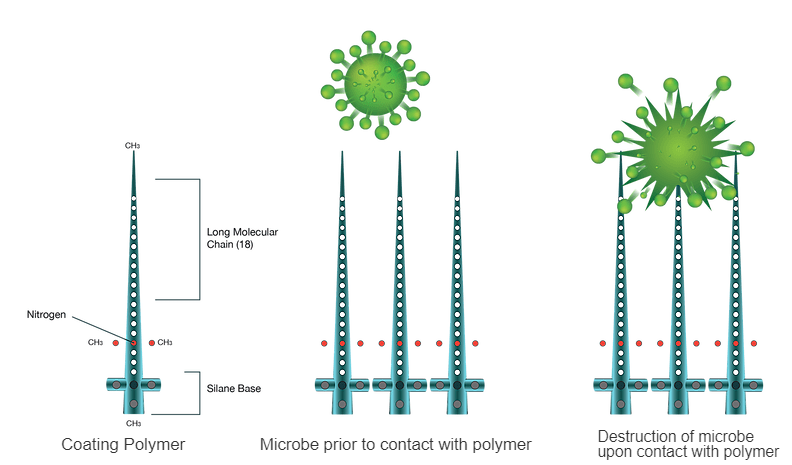 Our formula is a next generation water-based, long-term antimicrobial coating designed to inhibit the growth of microorganisms for extended periods after application. Once the coating has dried, it forms an invisible layer of “nanospikes” that penetrate and destroy cell membranes.